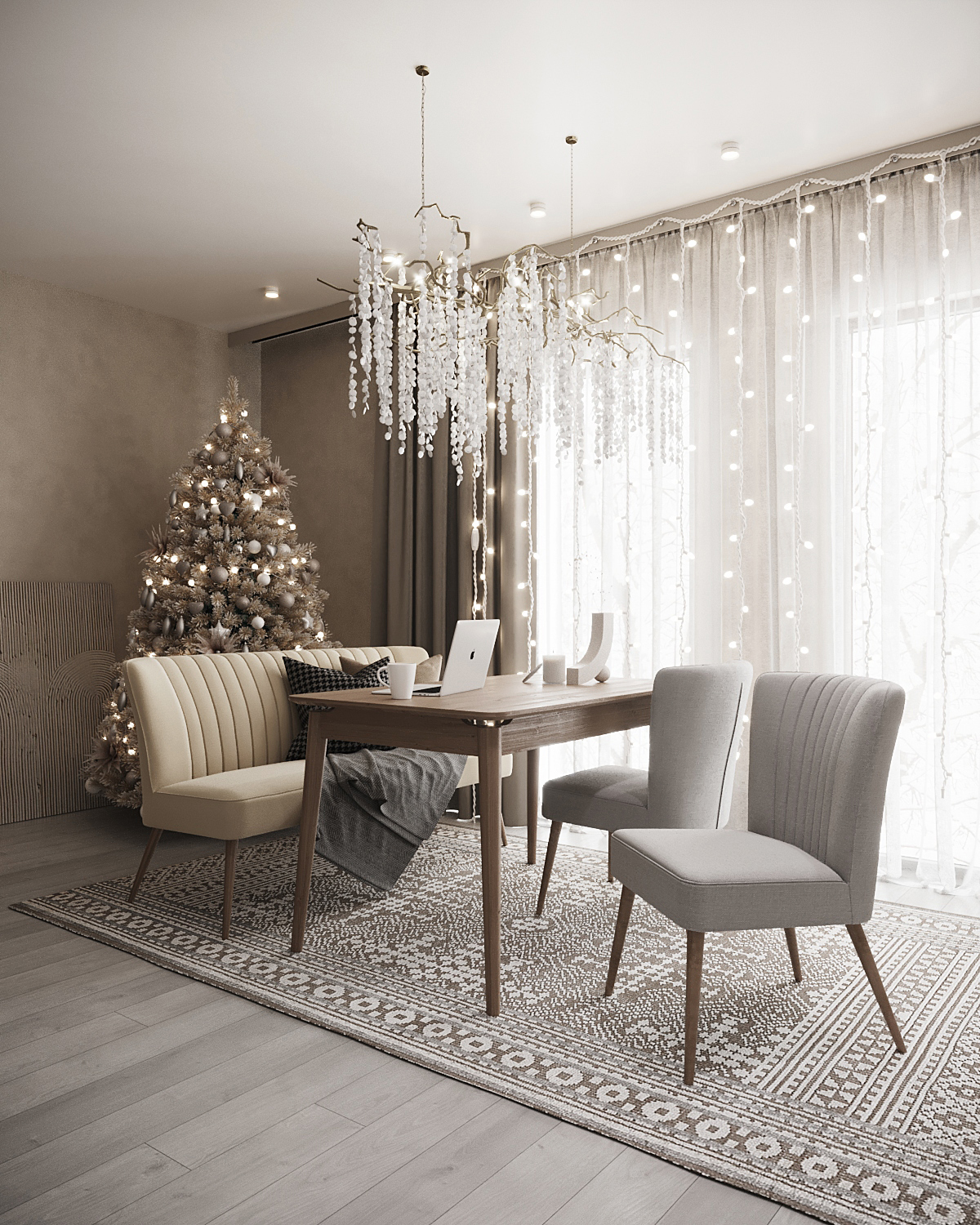 - Эко-акценты: бумажные звездочки, деревянные шары, натуральные ленты.